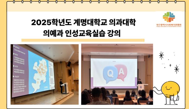 2025학년도 계명대학교 의과대학 인성교육실습 교과목(자원봉사) 강의 일시 : 2025.9.19(금) 15:00~17:50 장소 : 계명대학교 의과대학 백은관 202 대상 : 의예과 1학년 70여명 내용 : 의료인문 인성교육실습 "지역사회와 봉사활동" 학생들이 우리 지역 내 사회복지관의 역할과, 사업 내용 등을 통해 관심을 가질 수 있는 뜻 깊은 시간이 되었기를 바라며, 앞으로도 협회의 활동에 많은 관심 부탁드립니다. |