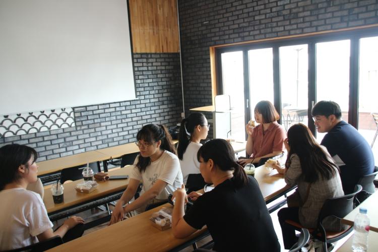 서로 마주보고 앉아 간식을 먹으며 서로를 알아가는 시간을 가졌습니다♥