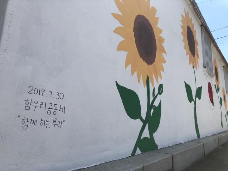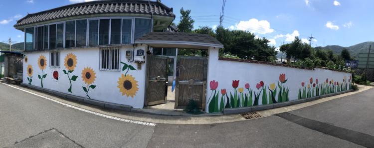 오늘은 함우리 공동체 벽화그리기 마무리 작업을 진행하였습니다. 오늘은 특별히 지역 줄리앙미술학원 원장님이 함께 해주셨습니다. 그림을 넣을 도안을 선택하고 해바라기와 튤립을 양쪽 벽면에 넣기로 결정하였습니다. 벽화가 완성되고 만족해하는 어르신의 모습에 힘들었지만 뿌듯하고 의미있는 활동이었습니다. 우리 마을의 밝은 분위기를 만들기 위해 작은 활동을 꾸준히 이어가는 함우리 공동체에게 많은 응원부탁드리며, 무더운 날씨에 처음하는 활동에도 불구하고 마지막까지 즐거운 얼굴로 함께해준 함우리 공동체와 줄리앙 미술학원에 감사드립니다.