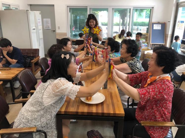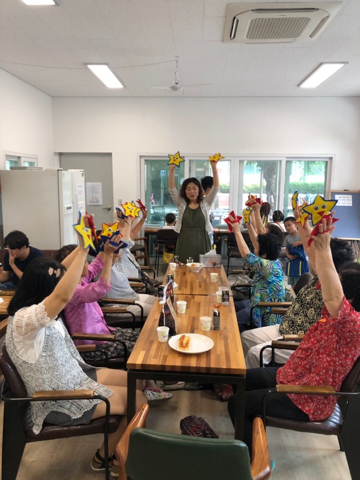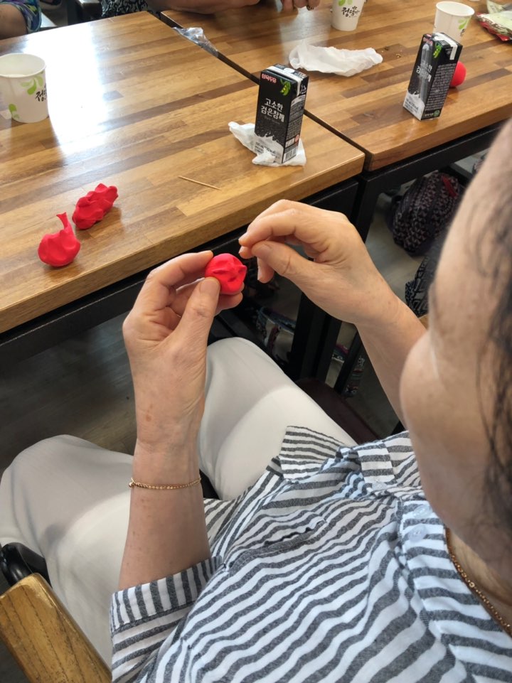 2019. 8. 12. 월요일, 여성독거노인 사회참여프로그램 "우,행.시" Silver Story Teller 22회기 활동이 진행되었습니다. 복지관 증축공사로 인하여 달성마을쉼터에서 수업을 진행하였습니다. 동화구연을 듣기 전, 손가락 체조 연습과 별 노래 연습을 시작으로 [요술항아리] 동화책을 들어보는 시간을 가졌습니다. 독후활동으로는 클레이로 "나의 요술000?"을 만들어 보며 이야기를 나누는 시간도 가졌습니다. 손을 움직이는 활동으로 "참여어르신 모두 뇌가 깨어나는 느낌이다, 손을 이렇게 많이 움직여본 적은 없는데 이번 동화구연 활동을 하면서 치매도 예방되는 것 같다." 라는 소감과 함께 몇회기 남지 않은 활동에 대한 아쉬움을 마음을 나타내었습니다.