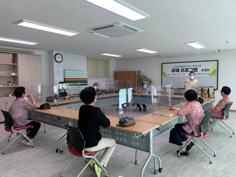 “지역주민이 365일 행복한 남산종합사회복지관입니다.” 7월 21일 (화) 우리 복지관 1층 프로그램실에서 <노인맞춤돌봄서비스 특화사업> 2그룹의 4회기 집단 프로그램 (공예) : 조명 만들기를 진행하였습니다. 화요일에 진행한 조명 만들기는 꽃무늬 도안을 다양한 컬러로 채색 후 조명을 담는 병에 붙이고 조명을 조립하여 작품을 완성하는 활동으로 채색을 통하여 우울함을 해소할 수 있는 효과를 볼 수 있다고 합니다. 여러가지 색상으로 다양한 무늬를 만들고 색상 배치를 하면서 집중하여 작품 완성 후 가지고 가면서 "매주 예쁜 걸 만들어가서 만족스럽고 고맙다"라는 말씀해주셨습니다. 앞으로도 지역주민의 행복을 위해 노력하는 남산종합사회복지관이 되겠습니다. 감사합니다. ***** 코로나-19 감염 예방 및 확산 방지를 위해, 참석자 전원은 체온 확인•손 소독•마스크 착용•가림막 설치 하였습니다.
