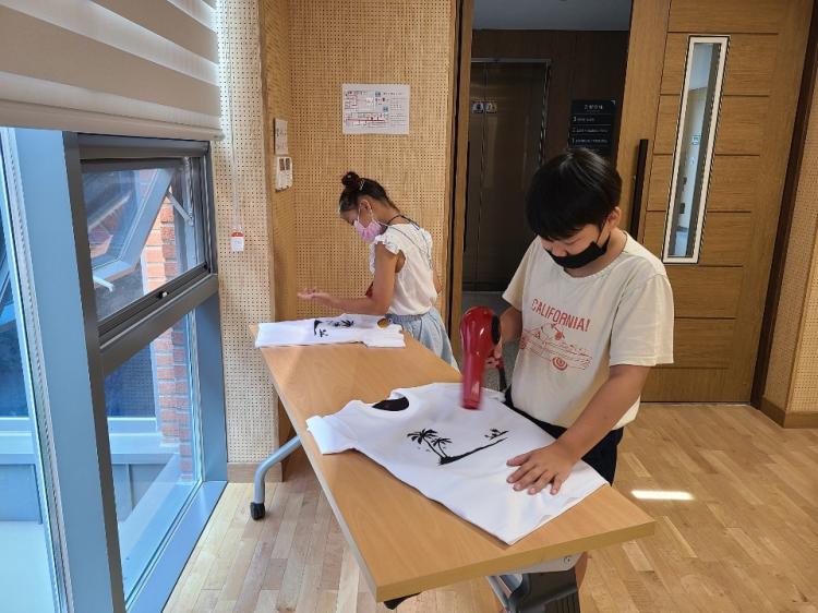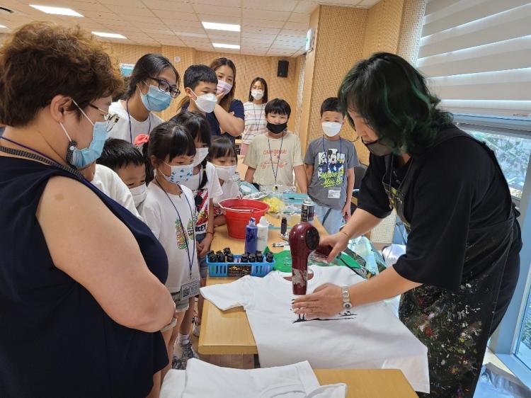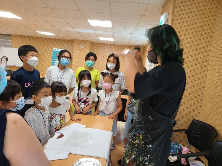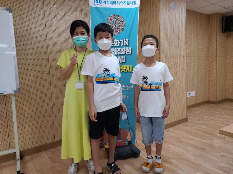 2020. 08. 22.(토) 2020년 8월 다문화가족양문화정체성 확립프로그램 '다문화브릿지' 테마별 집단활동&컨텐츠를 활용한 나눔활동을 실시하였습니다! 컨텐츠를 활용한 나눔활동으로 '우리 안에서의 나눔'을 주제로 나의 명함 만들기를 진행하며, 자기 자신을 소개하고, 서로를 더 알아가는 시간을 가졌습니다. 코로나19 확산 예방을 위하여 외부로의 나눔활동은 하지 못하였지만, 우리 안에서의 나눔을 통해 서로를 더 알아가고, 결속력을 다질 수 있는 시간이 되었습니다. 2부 활동으로는 테마별 집단활동으로 티셔츠 만들기를 진행하였습니다! 코로나19 확산으로 여름휴가를 떠나지 못한 아쉬움을 달래기 위하여 '여름 휴가 및 바닷가'를 배경그림으로 삼아 티셔츠를 꾸며보았습니다. 강사님의 지도 후 각자 자신만의 티셔츠를 꾸미고, 마지막에는 우리 가족에게 하고 싶은 말 또는 티셔츠에 새기고 싶은 말을 문구로 넣어 세상에 하나밖에 없는 티셔츠를 완성하였습니다! 티셔츠가 완성된 후 옷을 갈아입고 단체 사진을 찍고 활동을 마무리하였습니다