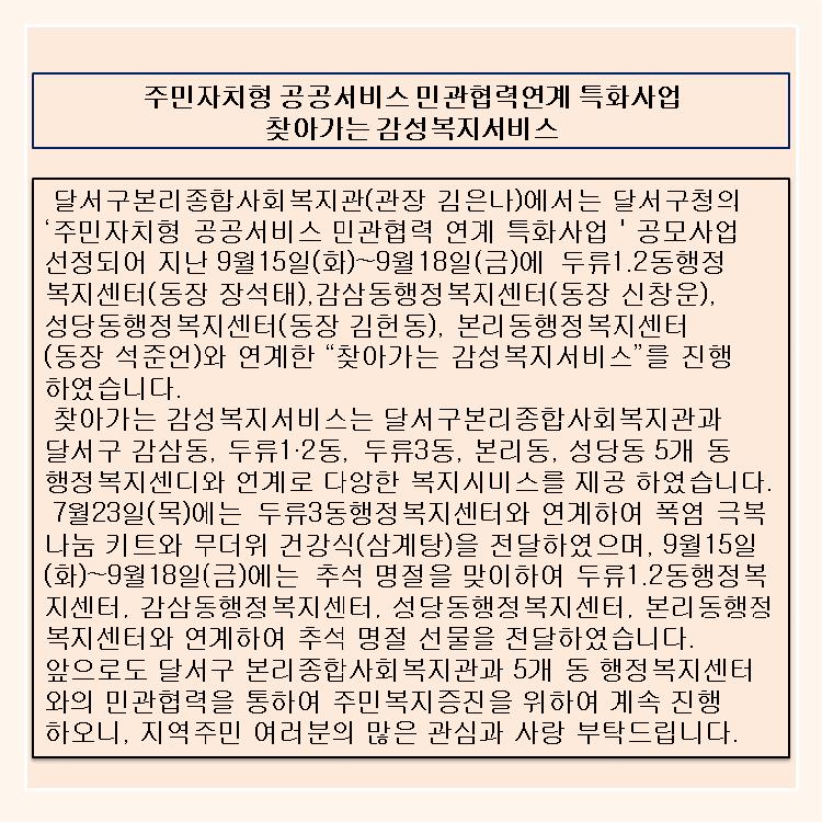 [달서구본리종합사회복지관]주민자치형 공공서비스 민관협력연계 특화사업 "찾아가는 감성복지서비스" 실시
