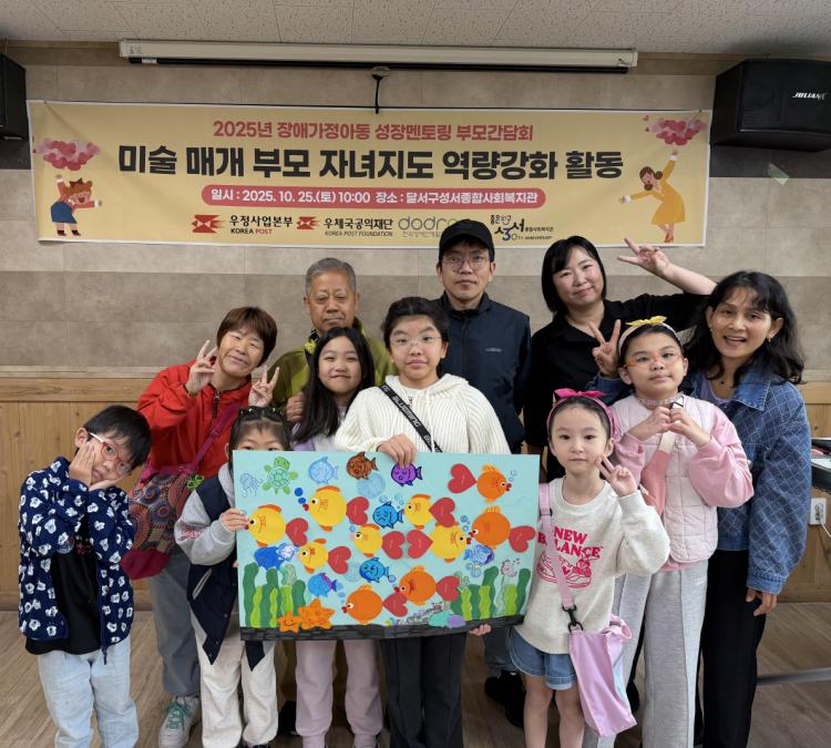 2025년 장애가정아동 성장멘토링 부모교육 및 간담회 미술매개 부모 자녀지도 역량강화 활동 지난 토요일 장애가정아동 성장멘토링 부모교육 및 간담회를 진행했습니다. 함께 색을 고르고, 선을 그으며 마음을 나누고 작은 펜끝에서 피어난 색처럼 사랑과 응원의 색이 짙어져 가는 교육이었습니다. 아이들이 건강하게 성장할 수 있도록 함께 응원해주세요 장애가정아동 성장멘토링은 우체국공익재단, 우체국우정사업본부 지원으로 한국장애인재활협회가 주관하여 달서구성서종합사회복지관이 수행하고 있습니다. |