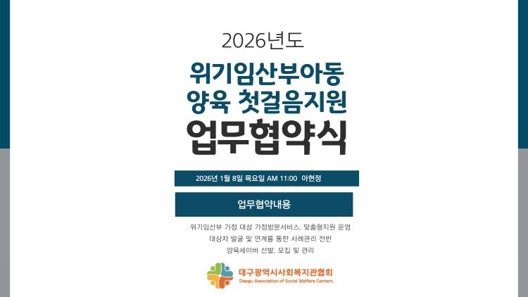 위기임산부아동 양육 첫걸음 지원사업을 위한 업무협약식 일시 :2026.1.8(목) 11:00 장소 : 아현정 참석 : 세이브더칠드런 동부지역본부 양승민 센터장, 오정현 매니저 대구광역시사회복지관협회 정병주 회장 및 28개소 사회복지관장 24명 내용 : 위기임산부 가정 대상 가정방문서비스, 맞춤형 지원 운영 대상자 발굴 및 연계를 통한 사례관리 전반 양육세이버 선발, 모집 및 관리.