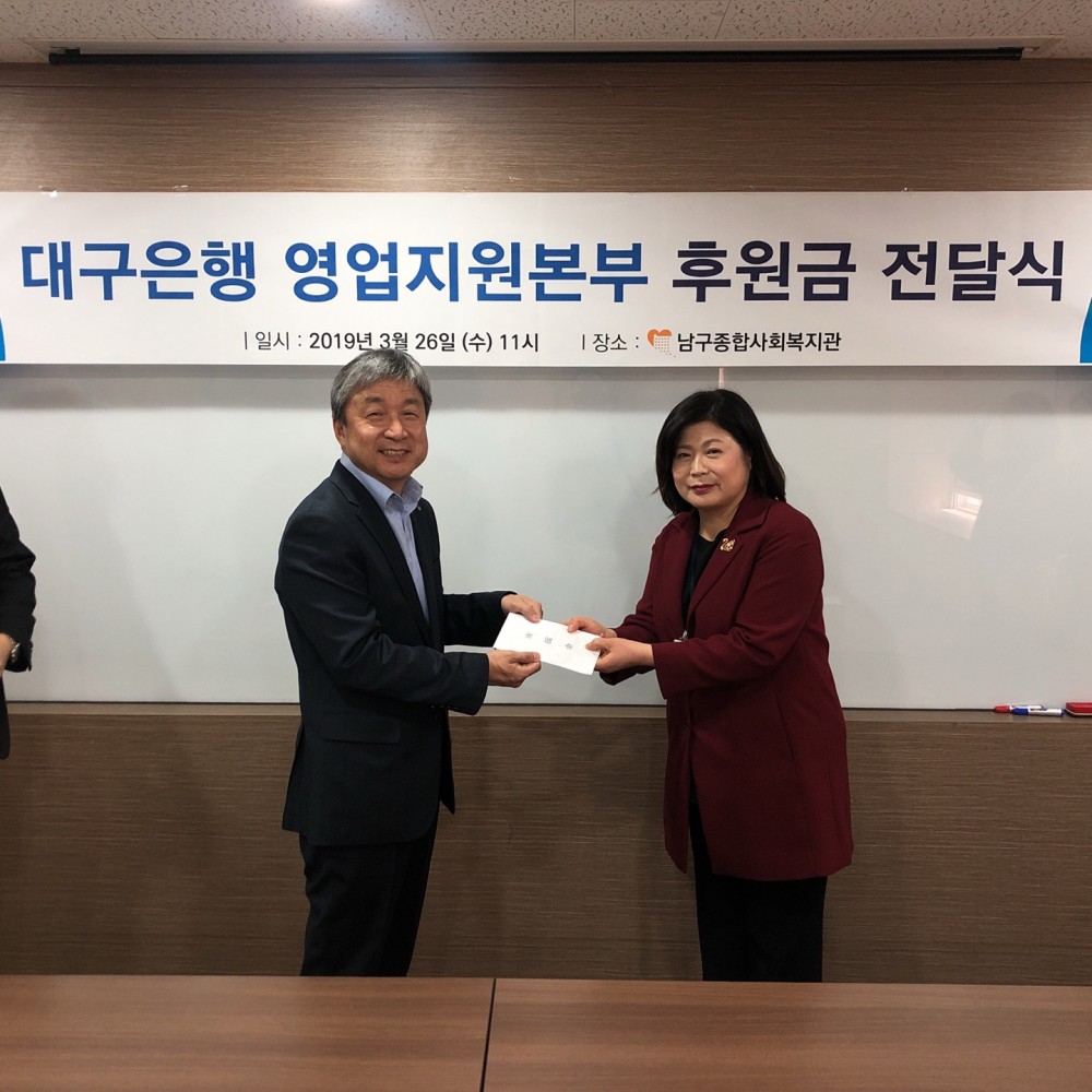 2019년 03월 26일, 대구은행(영업지원본부)에서 남구 지역주민 내 결식이 우려되는 65세 이상의 수급 및 저소득층인 150명의 어르신 및 장애인에게 균형잡힌 급식서비스를 제공 받기 바라는 마음으로 남구종합사회복지관 경로급식소에 후원금 100만원을 전달하였습니다. 남구종합사회복지관과 함께 후원금 또는 후원물품으로 희망을 나누기 원하시면 많은 연락 부탁드립니다 (☎ 남구종합사회복지관 476-7700) |