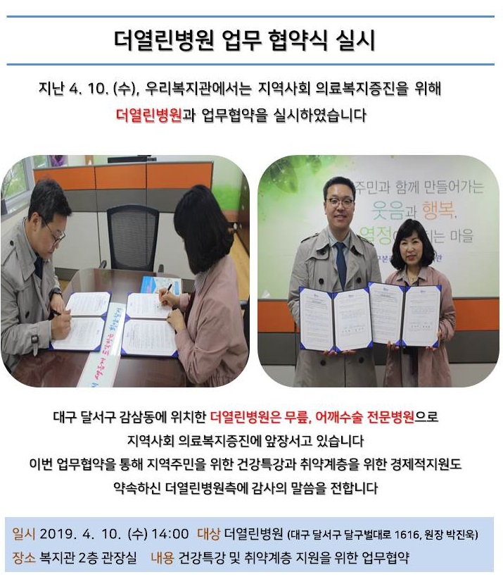 [달서구본리종합사회복지관] 더열린병원 업무협약 실시