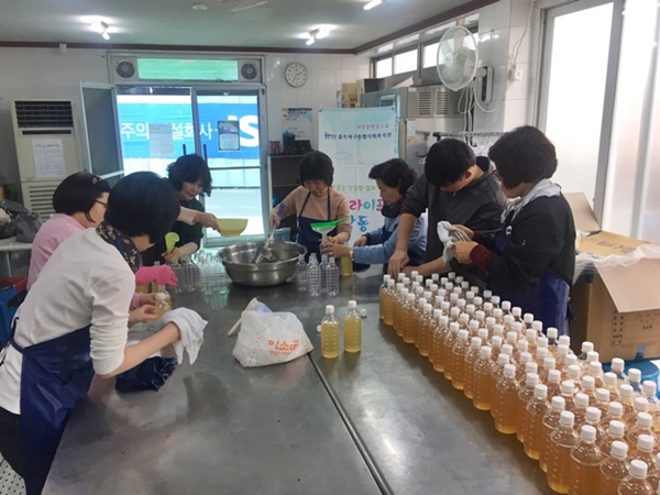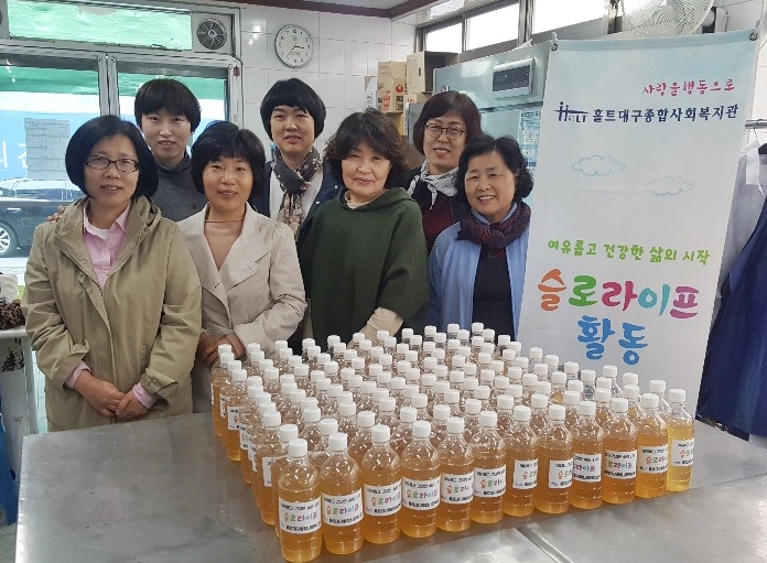 이번 4월에는 작년에 슬로푸드 활동의 일환으로 담가놓았던 매실액을 따로 보관해두었다가 다시 내어 깨끗한 용기에 나누어 나눔활동을 하기 위한 준비활동을 진행하였습니다. 작년과 동일하게 오래 숙성될수록 더욱 깊은 맛이 나는 매실액을 위하여 정성스레 보관하며 지켜봐왔었는데요. 깨끗한 용기에 옮겨 담으면서 맛을 보았을 때 마트에서 사 온 매실주스보다도 더 맛있는 새콤달콤한 맛이 났습니다. 깨끗하게 담궈진 매실액을 보며 회원들 모두 뿌듯해 하시며, 이 매실액을 받을 지역주민들을 생각하며 기분들이 좋으셨습니다. 다음 날 무료급식을 통해서 저소득 대상자들에게 매실액을 전달하기로 결정하고 예쁜 라벨지를 붙이며 즐겁게 활동을 진행하였습니다. 또한 저소득 대상자들에게 나눔활동을 하고 남은 것은 홀트서포터즈-활동으로 ‘우리동네를 아름답게 수(手)놓다’ 활동시 참여 주민들에게 나눔을 하기로 계획하였습니다. 앞으로도 더욱 즐겁고 슬로라이프활동이 될 수 있도록 더욱 노력하겠습니다. 슬로라이프에 대해 관심이 있으시거나 저희와 함께 활동하시고 싶은 분들이 있으시다면 복지관으로 문의해주시면 감사하겠습니다. ^-^