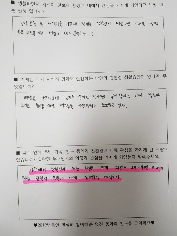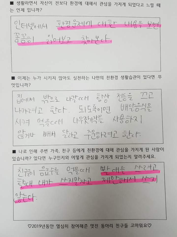 3월부터 진행된 친환경청소년동아리 Pl-earth, minus가 최종평가회를 실시하였습니다. 평가회를 통해 그동안 동아리에 참가하면서 자신이 느낀 소감을 나누어보니 나의 관심이 가족과 친구의 관심이 되어