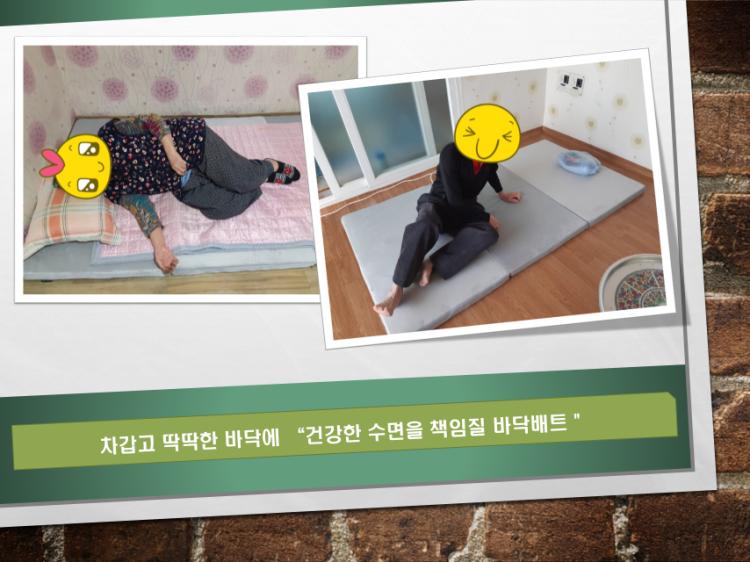 “밥이 보약이다.”라는 말처럼 밥 만큼이나 중요한 것은 수면이라고 합니다. 건강한 수면을 유지하지 못하면 우울증, 만성질환 등으로 심리정서적인 문제를 일으키기도 하고, 무엇보다 신체적으로 건강한 하루를 시작 할 수가 없습니다. 건강한 수면은 곧 건강한 하루를 보장하기 때문입니다. 이처럼 어르신분들께 가장 중요한 건 바로 수면의 질입니다. "건강한 수면" 저희 본리복지관에서는 혼자 사시는 어르신들의 건강한 수면을 지켜드리고자, "카카오같이가치" 온라인 모금채널을 활용하여 부드럽고 따뜻한 바닥매트를 구매하여 전달하였습니다. "기능성 매트를 합리적인 가격으로 구매하여, 독거어르신분들의 건강한 수면에 도움을 드렸습니다." "지역사회 모금 플랫폼을 활용하여, 나눔문화의 장으로 초대하여 따뜻한 온기를 독거어르신분들께 전달했습니다" "함께 해주신 6,694명의 후원자님 그리고 도움주신 카카오같이가치 관계자분들께 진심으로 감사드립니다." *모금채널 : 카카오같이가치 *모금기간 : 2019.11.14 ~ 2020.01.14 *사업기간 : 2020.02.01 ~ 2020.03.05 *모금완료액 : 2,829,000원 *후원참여인원 : 총 6,694명(직접기부 : 264명, 참여기부 : 6,430명) *전달대상자 : 총 30명(독거어르신) *전달물품 : 바닥매트 1점/1인 *담당자 : 달서구본리종합사회복지관, 김의석 대리