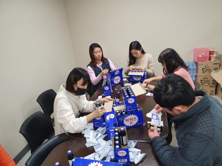 코로나19로 많이 힘들었던 지역의 후원자님들을 위해 복지관 직원들이 한병한병 만든 박카스 메모^^ 후원자님의 성함을 병마다 넣었더니 저희의 사랑이 더 전달되어 더 기뻐 하시네요^^ 웃을 일을 만들어 드리기 위해 직원들이 함께 참여한 코로나극복 율동큐알도 실었습니다... 하루 빨리 코로나가 종식되었으면 좋겠습니다. |