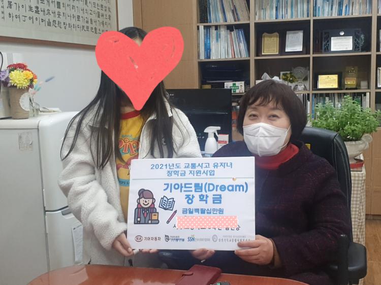 지난 12일(금), 기아자동차(주)와 한국사회복지협의회가 실시하는 "2021 기아드림(Dream) 장학금" 에 복지관 추천 학생이 선정되어 장학금 전달식을 실시하였습니다. 위 사업은 교통사고 피해를 입은 가정의 자녀에게 경제적 어려움을 극복하고 건강한 사회구성원으로 성장할 수 있도록 장학금을 지원하는 것인데요, 위 가정의 밝은 미래를 소망하며 앞으로도 더불어 살아가는 복지관이 되겠습니다^^