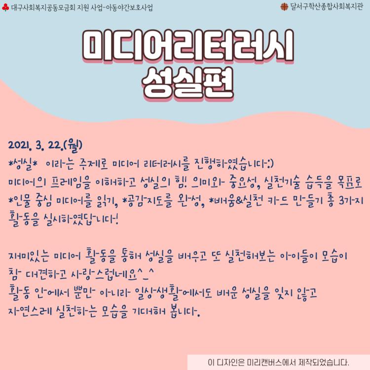 [달서구학산종합사회복지관] 창의인성교육 '성실' 미디어리터러시