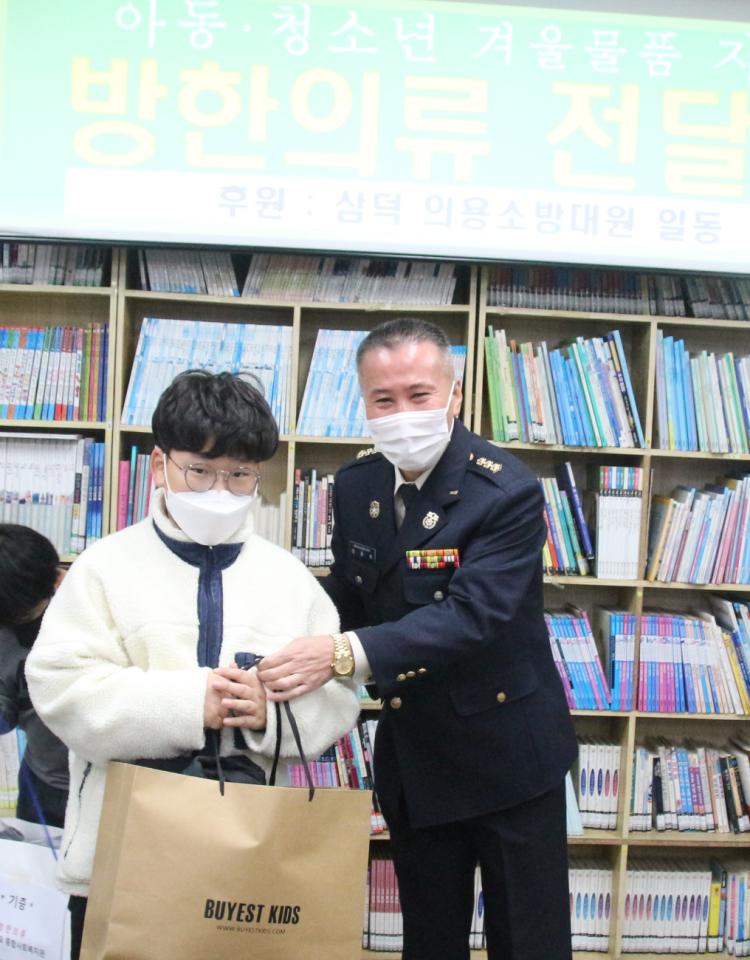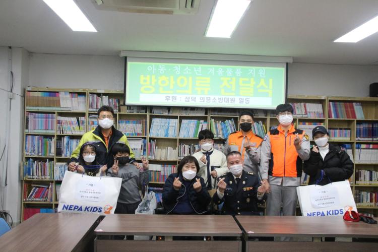 12월 3일(금), 복지관 4층에서 아동·청소년 겨울물품지원 방한의류 전달식이 실시되었습니다. 지역 내 아동들을 대상으로 삼덕 의용소방대 김용복 지대장님 외 대원 분들이 마음을 모아 70만원 상당의 아동·청소년 패딩을 후원해주셨습니다. 패딩을 입고 좋아하는 아이들의 밝은 웃음이 보는 사람들의 마음까지 따뜻하게 만들어주는 시간이었습니다. 방한의류를 후원해주신 삼덕 의용소방대에 다시 한 번 감사드리며, 아동·청소년 지원에도 힘쓰는 복지관이 되겠습니다.
