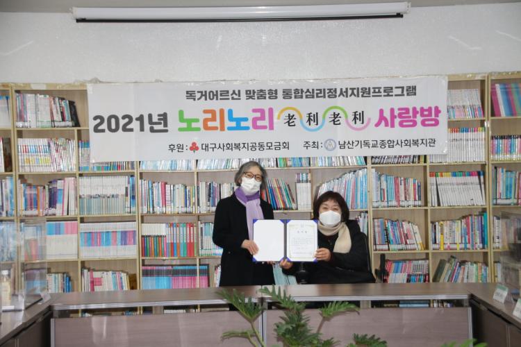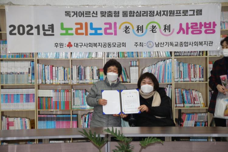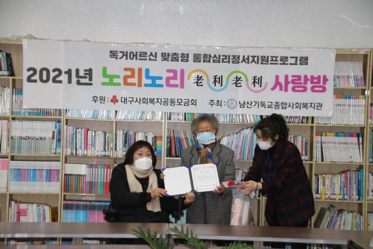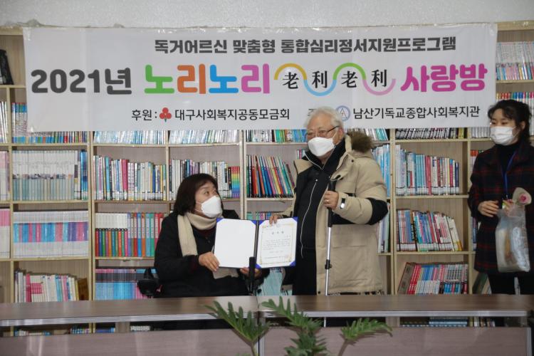 지난 11일(토), 2021년 대구사회복지공동모금회 후원 독거어르신 맞춤형 심리·정서지원 프로그램 노리노리사랑방 최종평가회가 실시되었습니다. 한 해 간 프로그램에 열심히 참여한 20명의 어르신들을 대표해 9명의 어르신이 복지관 4층에 모여 함께 1년 간 활동했던 영상도 보고, 소감도 말하고, 감사장 및 기념선물과 도시락도 전달받는 시간이 이어졌습니다. 어르신들 모두 1년동안 고생하셨고, 내년에도 즐거운 마음으로 뵐 수 있었으면 좋겠습니다. 추운 날씨에 건강 조심하세요♥