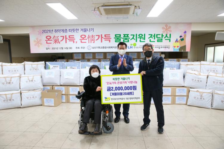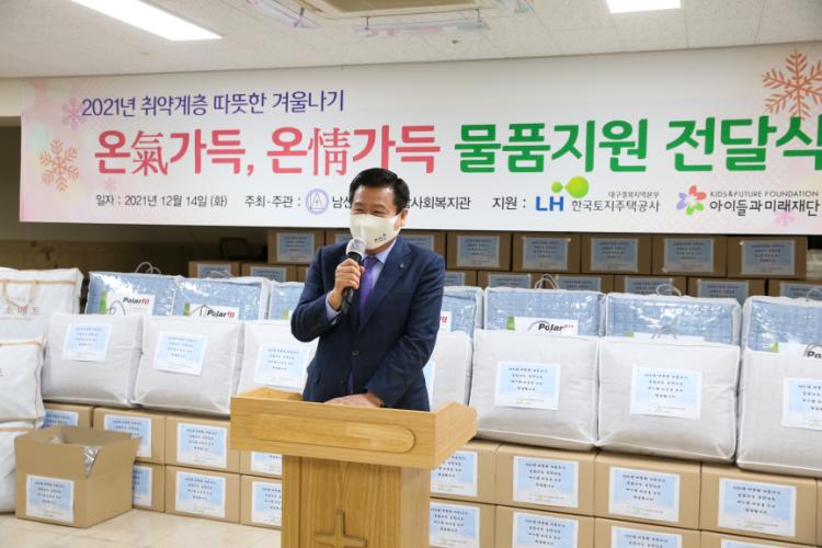 우리 복지관에서는 매년 혹한기에 대비해 지역 내 취약계층 세대에 물품을 지원하고 있습니다. 올해도 영하권 강추위가 다가왔지만 따뜻한 사랑의 손길은 뜨겁게 이어지는 것 같습니다. 직원들의 제안으로 아이들과 미래재단에서 2천만 원 상당의 탄소매트와 LH한국토지주택공사 대구경북지역본부에서 2백만 원 상당의 이불세트를 후원해주셨고, 그 외에도 지역 내 작은 정성들을 모아 방한키트, 전기장판, 방한 의류 등을 준비하여 지역 내 320여 세대에 3,100만원 상당의 온기와 온정을 담은 물품을 전해드릴 수 있게 되었습니다. 이에, 14일(화) 실시한 2021년 따뜻한 겨울나기 물품지원 전달식에 류규하 중구청장님, 한국토지주택공사 대구경북지역본부 서남진 본부장님 외 직원들과 지역 어르신들이 참석해 전달식을 축하해주셨습니다. 앞으로도 시기별로 복지서비스 제공에 노력을 게을리하지 않고 지역사회와 끊임없이 소통하며 지내는 복지관이 되겠습니다.^^
