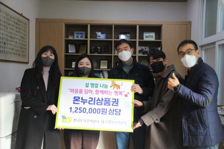 2022년 1월, 다가올 설 명절을 맞아 LH한국토지주택공사 대구경북지역본부에서 복지관에 1,250,000원 상당의 온누리상품권을 지원해주셨습니다. 상품권은 지역 내 필요한 저소득계층에 잘 지원하도록 하겠습니다. “마음을 담아, 함께하는 행복” 설 명절 나눔에 함께해주셔서 감사드립니다^^